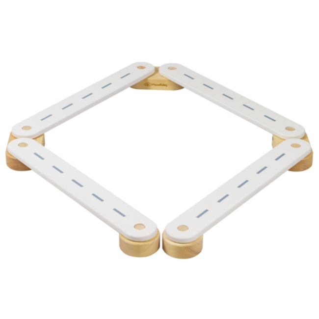 Das Set besteht aus 4 stabilen Balken, 3 Verbindungselementen und 2 Endstücken, mit denen Kinder ihre eigenen Parcours und Spielideen gestalten können. Die Balken sind mit eingefrästen Symbolen und Formen versehen, sodass Kinder spielerisch Zahlen, geometrische Figuren und Grundkenntnisse der Mathematik entdecken können. Sie können auch umgedreht und als Straßen für Spielzeugautos genutzt werden, um Kreativität und Fantasie zu fördern.