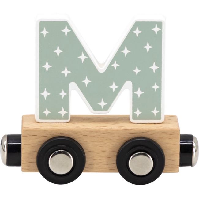 Grüner Holzwagen mit dem Buchstaben M und Magnetkupplung. Schön für einen Namenszug oder als Deko im Kinderzimmer. Lesen Sie mehr.