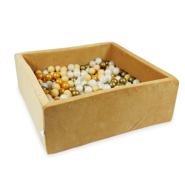Weicher quadratischer Samt-Ballpool in Caramel mit 600 Bällen – perfekt für stundenlangen Spielspaß im Kinderzimmer. Lesen Sie mehr.