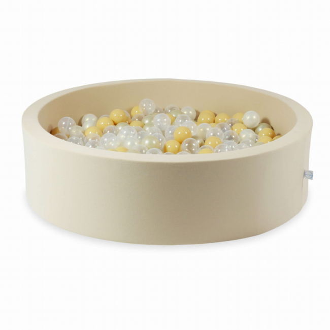 Hypoallergenic round ball pit Ø110x30 cm for 400 balls in beige cotton. Sturdy, safe and easy to clean for hours of play. Read more.
