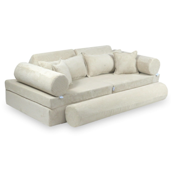 Ce canapé de jeu Montessori de luxe en Corduroy beige doux est un meuble ludique soigneusement conçu, alliant jeu, confort et style. Grâce à ses 13 éléments légers et modulables, les enfants peuvent construire, combiner et explorer à l’infini. Cabane, rampe d’escalade ou espace détente cosy : ce canapé accompagne l’imagination et le développement de votre enfant.