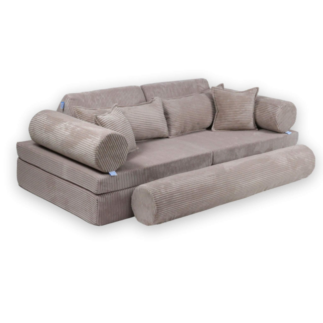 Le canapé est fabriqué en mousse souple et résistante, recouverte d’un Corduroy côtelé durable. Le tissu est doux tout en étant adapté à une utilisation quotidienne. Les housses sont amovibles et lavables en machine à 30 °C. Le canapé respecte les normes de sécurité CE et EN-71.
