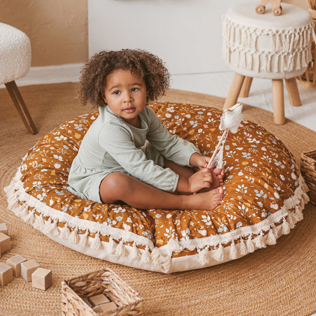 Coussin de sol doux avec franges et motif fleuri. Idéal pour un coin jeu ou lecture chaleureux. Lire plus.