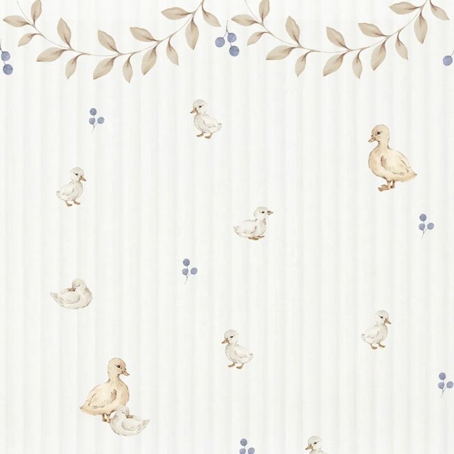 Le papier peint Canetons & Baies de la collection Meadow Friends est un choix raffiné pour la chambre de bébé ou d'enfant. Le design combine une rayure verticale très subtile en arrière-plan avec de superbes illustrations à l'aquarelle de petits canetons et de branches de baies bleues. Ce papier peint apporte une atmosphère intemporelle et apaisante à l'intérieur.