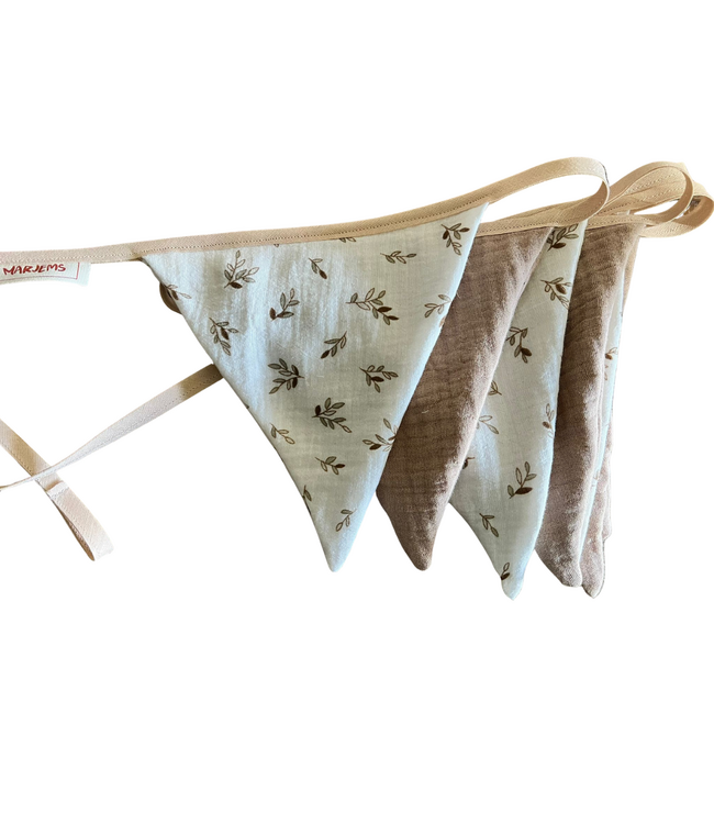Deze unieke vlaggenlijn bestaat uit 8 vlaggetjes, elk vervaardigd uit een mix van mousseline, dubbel gehaakte stoffen kleine takken en drielaagse katoenen mousseline in een warme beige en donkerbeige kleur. Elk vlaggetje meet ongeveer 16 x 18 cm en de gehele slinger heeft een lengte van circa 2,6 meter. Omdat de vlaggenlijn handgemaakt is, kunnen afmetingen licht variëren, wat elk exemplaar uniek maakt.