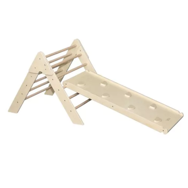 Breng de speeltuin naar huis met dit veelzijdige houten klimrek dat fungeert als glijbaan én klimmuur! Dit 2-in-1 Montessori-geïnspireerde speeltoestel is perfect voor binnen en buiten en stimuleert de motoriek, balans en creativiteit van je kind.