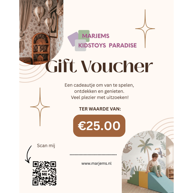 Kun je niet kiezen uit ons uitgebreide assortiment educatief speelgoed, houten materialen of sensorische sets? Met de Marjems cadeaubon geef je de ontvanger de vrijheid om zelf hun favoriete items uit te zoeken. Of het nu gaat om een kraamcadeau, een verjaardag of een extraatje voor in de klas, een cadeaubon valt altijd in de smaak bij zowel ouders, leerkrachten als kinderen.