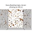 Het kleurgebruik bestaat uit een zachte witte basis, aangevuld met subtiele accenten in warme natuurtinten. Deze combinatie zorgt voor: