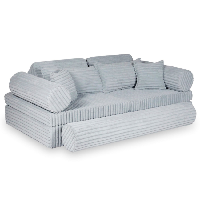 De bank is volledig gemaakt van zachte schuimvulling en bekleed met een stevige, grove Waffle stof (vergelijkbaar met extra grove corduroy). De hoezen zijn afneembaar en wasbaar op 30°C, zodat alles mooi fris blijft – ook bij intensief gebruik.