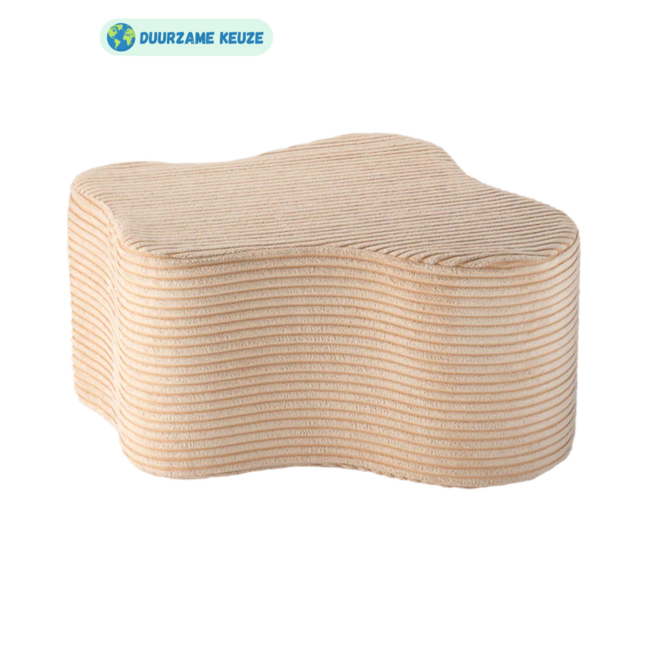 De poef is ontworpen met aandacht voor zowel duurzaamheid als stijl. De buitenstof is van OEKO-TEX®-gecertificeerd corduroy, een stof die voldoet aan de hoogste milieunormen. De vulling van polyurethaanschuim biedt een uitstekende balans tussen comfort en ondersteuning, perfect voor langdurig gebruik door kinderen.