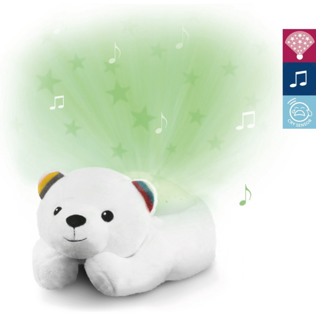 Met de Zazu sterrenhemelprojector Polly de ijsbeer creëer je een magische sterrenhemel op het plafond, gecombineerd met kalmerende geluiden. Zo krijgt je kleintje een rustige en veilige omgeving om zachtjes in slaap te vallen.