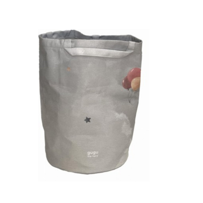 De speelgoedmand in Balloon Dream stijl heeft een rustige grijze kleur met een zachte print van een paar zwevende ballonnen. Deze subtiele illustratie geeft een dromerige en kalme sfeer aan de kinderkamer en past perfect in een minimalistisch of Scandinavisch interieur.